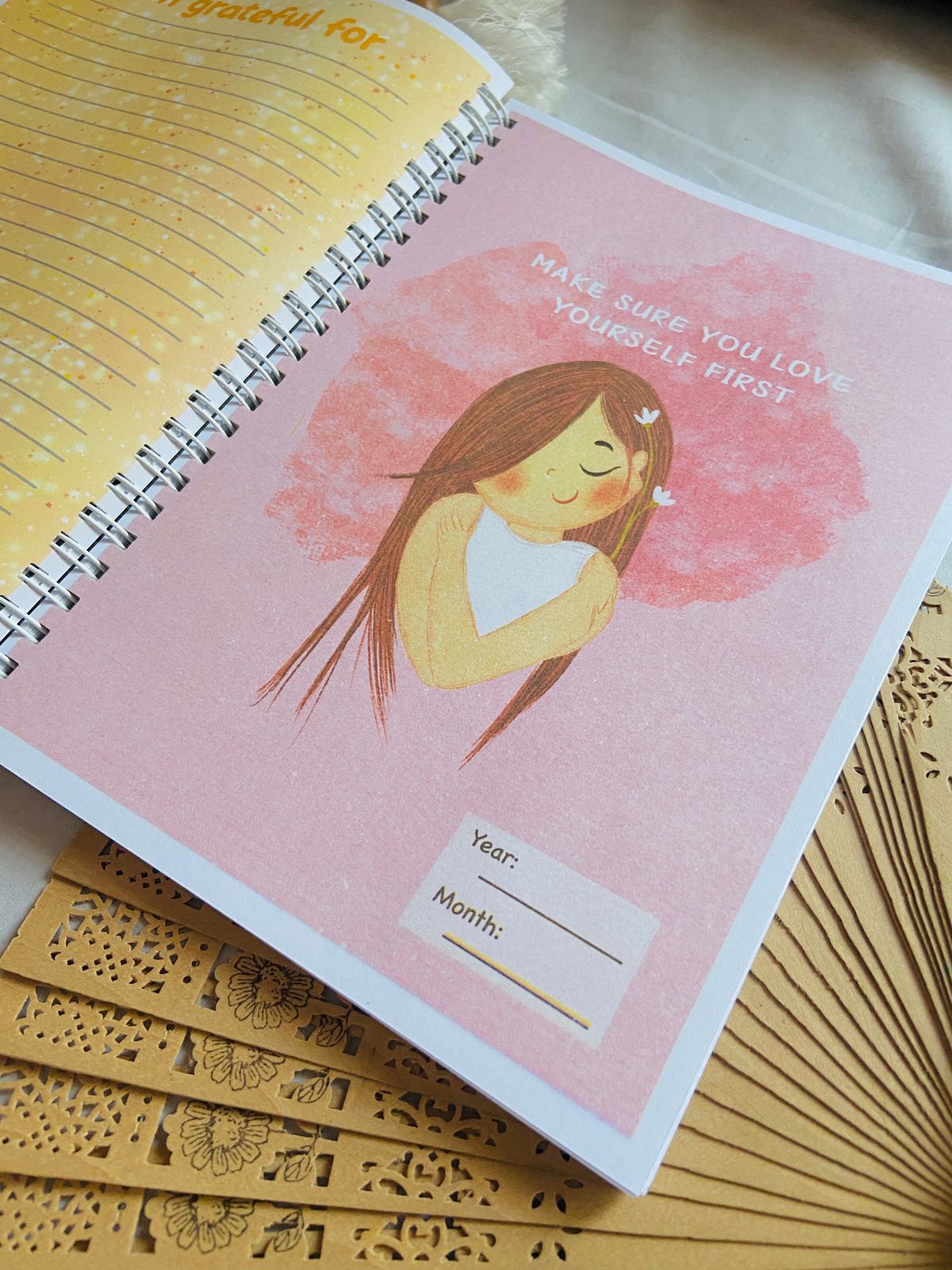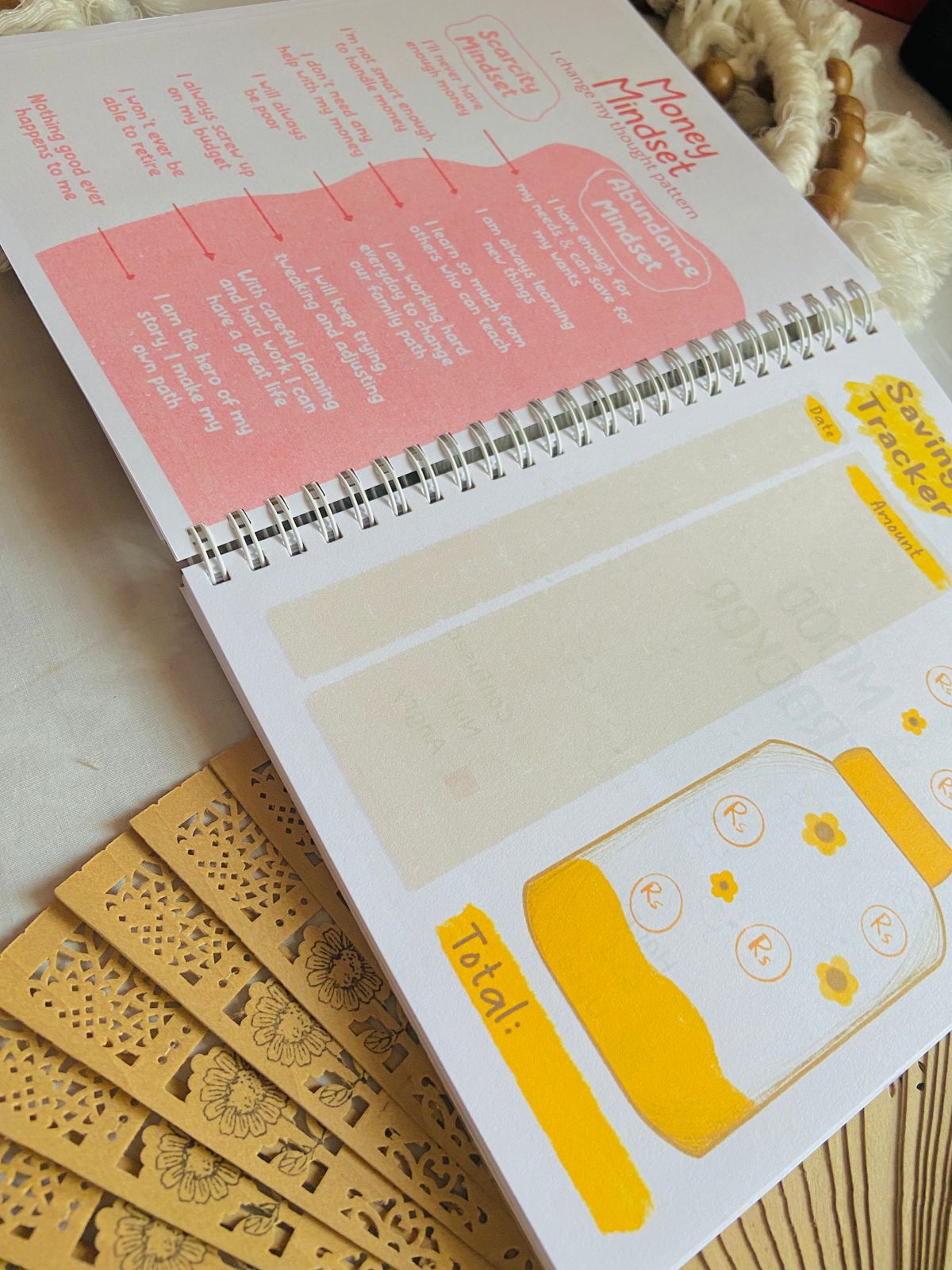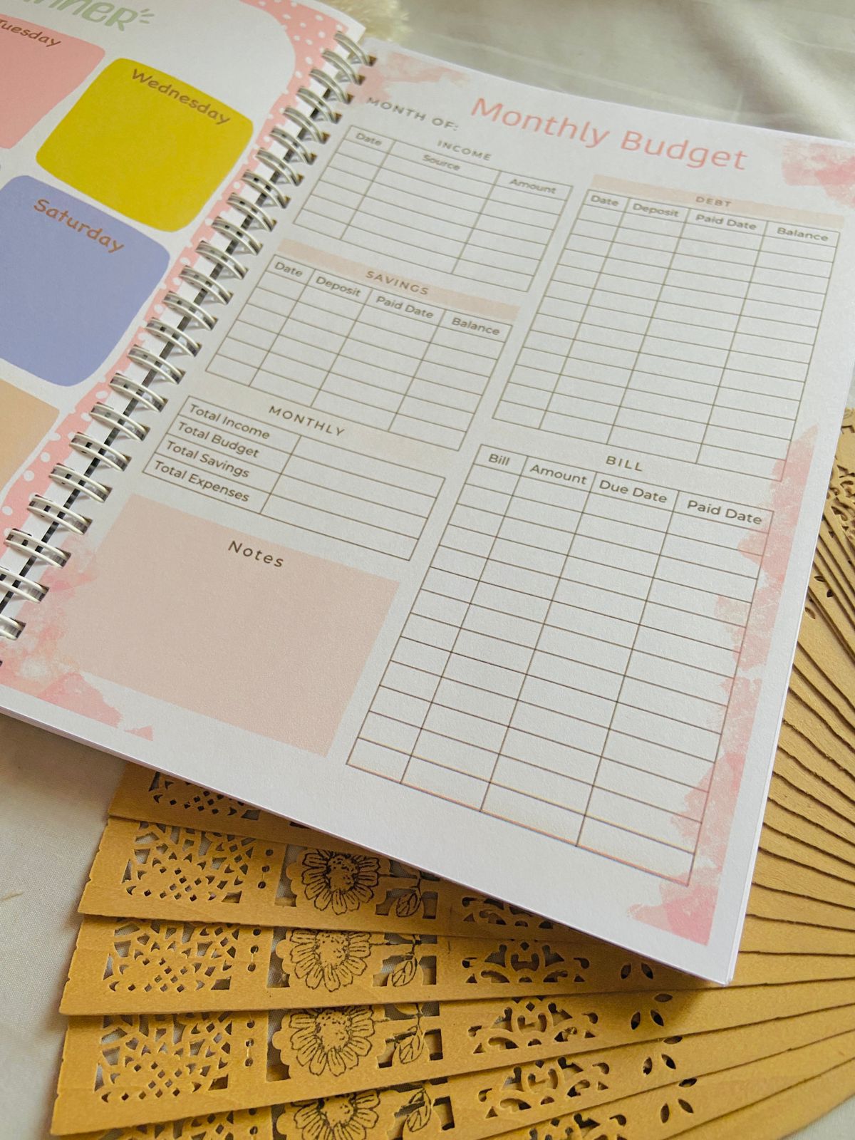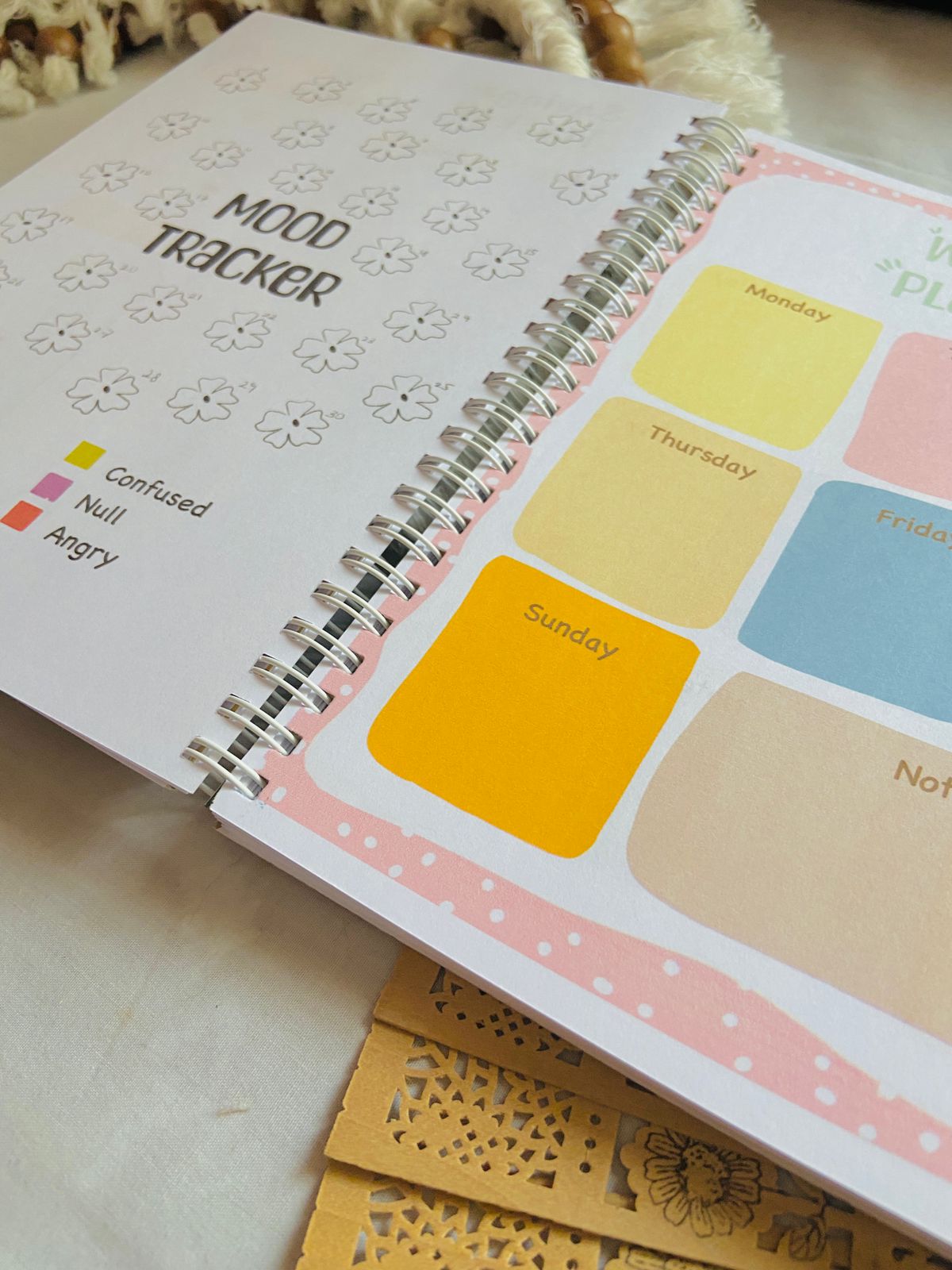 Task Page, Habit tracker, mood tracker, Weekly planner, Gratitude pages, Budget Page and special positive content pages.